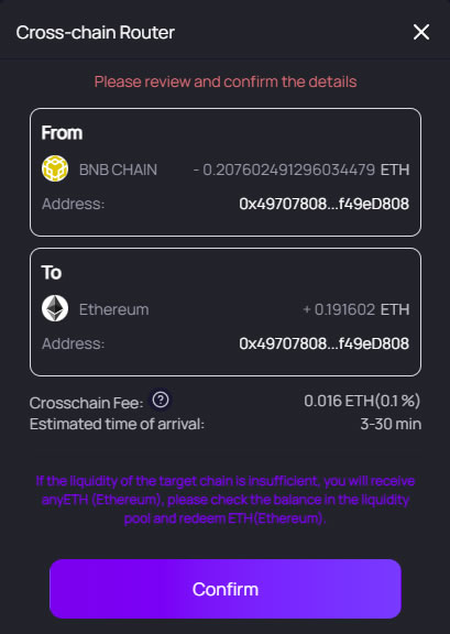 This is what the confirm screen will look like when bringing ETH from BNB Chain to Ethereum mainnet: